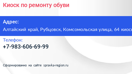 Киоск по ремонту обуви по адресу Алтайский край, Рубцовск, Комсомольская улица, 64 киоск в дальнейшем Организация, размещена в следующих категориях: