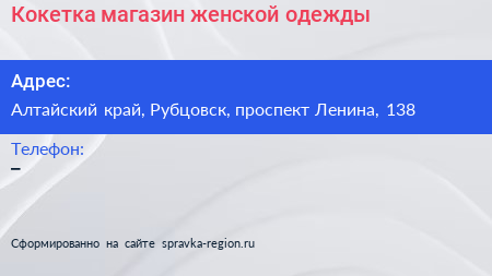 Кокетка, магазин женской одежды по адресу Алтайский край, Рубцовск, проспект Ленина, 138 в дальнейшем Организация, размещена в следующих категориях: