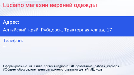 Luciano, магазин верхней одежды по адресу Алтайский край, Рубцовск, Тракторная улица, 17 в дальнейшем Организация, размещена в следующих категориях: