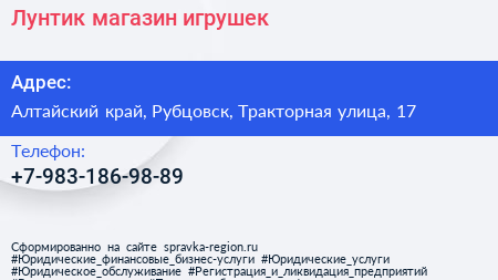 Лунтик, магазин игрушек по адресу Алтайский край, Рубцовск, Тракторная улица, 17 в дальнейшем Организация, размещена в следующих категориях: