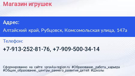 Магазин игрушек по адресу Алтайский край, Рубцовск, Комсомольская улица, 147а в дальнейшем Организация, размещена в следующих категориях: