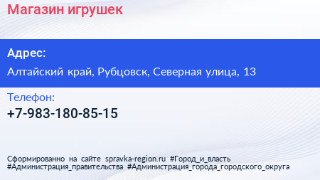 Магазин игрушек по адресу Алтайский край, Рубцовск, Северная улица, 13 в дальнейшем Организация, размещена в следующих категориях: