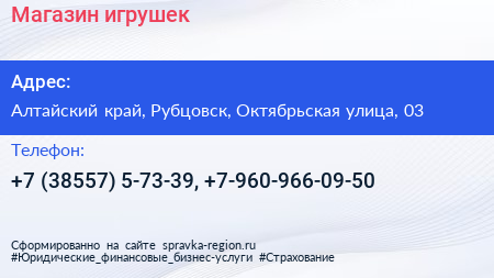 Магазин игрушек по адресу Алтайский край, Рубцовск, Октябрьская улица, 03 в дальнейшем Организация, размещена в следующих категориях: