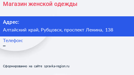 Магазин женской одежды по адресу Алтайский край, Рубцовск, проспект Ленина, 138 в дальнейшем Организация, размещена в следующих категориях: