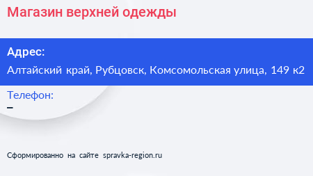 Магазин верхней одежды по адресу Алтайский край, Рубцовск, Комсомольская улица, 149 к2 в дальнейшем Организация, размещена в следующих категориях: