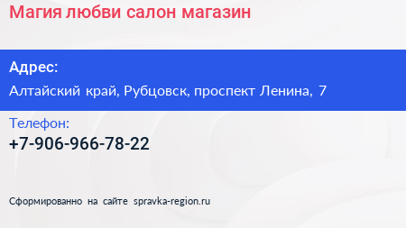 Магия любви, салон-магазин по адресу Алтайский край, Рубцовск, проспект Ленина, 7 в дальнейшем Организация, размещена в следующих категориях: