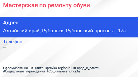 Мастерская по ремонту обуви по адресу Алтайский край, Рубцовск, Рубцовский проспект, 17а в дальнейшем Организация, размещена в следующих категориях: