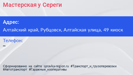 Мастерская у Сереги по адресу Алтайский край, Рубцовск, Алтайская улица, 49 киоск в дальнейшем Организация, размещена в следующих категориях: