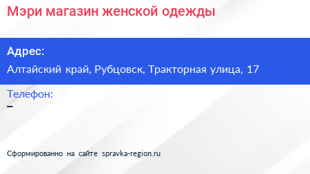 Мэри, магазин женской одежды по адресу Алтайский край, Рубцовск, Тракторная улица, 17 в дальнейшем Организация, размещена в следующих категориях: