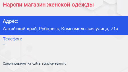Нарспи, магазин женской одежды по адресу Алтайский край, Рубцовск, Комсомольская улица, 71а в дальнейшем Организация, размещена в следующих категориях:
