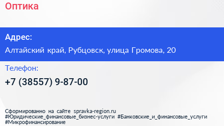 Оптика по адресу Алтайский край, Рубцовск, улица Громова, 20 в дальнейшем Организация, размещена в следующих категориях: