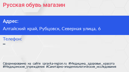 Русская обувь, магазин по адресу Алтайский край, Рубцовск, Северная улица, 6 в дальнейшем Организация, размещена в следующих категориях: