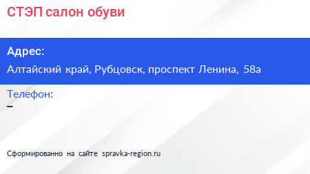 СТЭП, салон обуви по адресу Алтайский край, Рубцовск, проспект Ленина, 58а в дальнейшем Организация, размещена в следующих категориях: