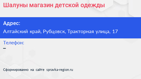 Шалуны, магазин детской одежды по адресу Алтайский край, Рубцовск, Тракторная улица, 17 в дальнейшем Организация, размещена в следующих категориях:
