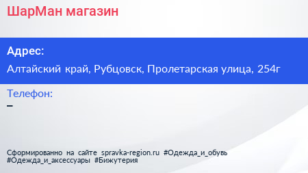 ШарМан, магазин по адресу Алтайский край, Рубцовск, Пролетарская улица, 254г в дальнейшем Организация, размещена в следующих категориях: