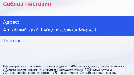 Соблазн, магазин по адресу Алтайский край, Рубцовск, улица Мира, 8 в дальнейшем Организация, размещена в следующих категориях: