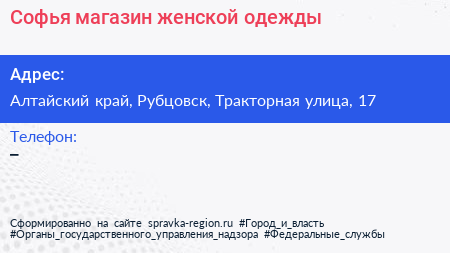 Софья, магазин женской одежды по адресу Алтайский край, Рубцовск, Тракторная улица, 17 в дальнейшем Организация, размещена в следующих категориях: