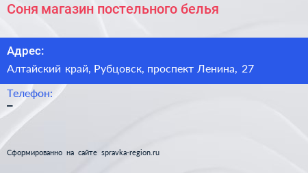 Соня, магазин постельного белья по адресу Алтайский край, Рубцовск, проспект Ленина, 27 в дальнейшем Организация, размещена в следующих категориях: