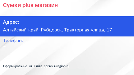 Сумки plus, магазин по адресу Алтайский край, Рубцовск, Тракторная улица, 17 в дальнейшем Организация, размещена в следующих категориях:
