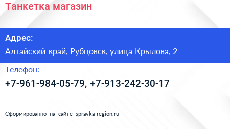 Танкетка, магазин по адресу Алтайский край, Рубцовск, улица Крылова, 2 в дальнейшем Организация, размещена в следующих категориях:
