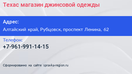Техас, магазин джинсовой одежды по адресу Алтайский край, Рубцовск, проспект Ленина, 62 в дальнейшем Организация, размещена в следующих категориях:
