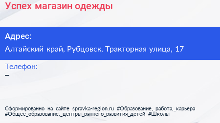 Успех, магазин одежды по адресу Алтайский край, Рубцовск, Тракторная улица, 17 в дальнейшем Организация, размещена в следующих категориях:
