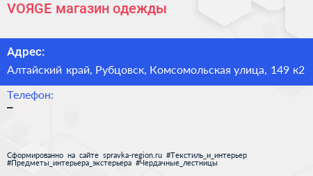 VOЯGE, магазин одежды по адресу Алтайский край, Рубцовск, Комсомольская улица, 149 к2 в дальнейшем Организация, размещена в следующих категориях:
