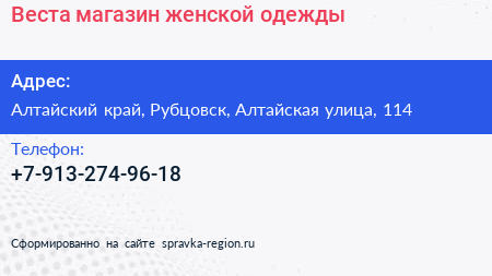 Веста, магазин женской одежды по адресу Алтайский край, Рубцовск, Алтайская улица, 114 в дальнейшем Организация, размещена в следующих категориях: