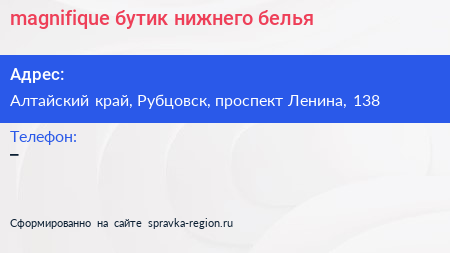 magnifique, бутик нижнего белья по адресу Алтайский край, Рубцовск, проспект Ленина, 138 в дальнейшем Организация, размещена в следующих категориях: