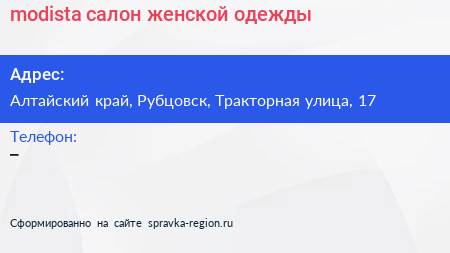 modista, салон женской одежды по адресу Алтайский край, Рубцовск, Тракторная улица, 17 в дальнейшем Организация, размещена в следующих категориях: