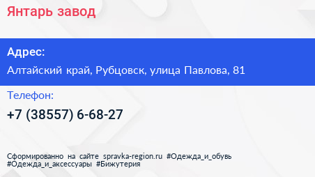 Янтарь, завод по адресу Алтайский край, Рубцовск, улица Павлова, 81 в дальнейшем Организация, размещена в следующих категориях: