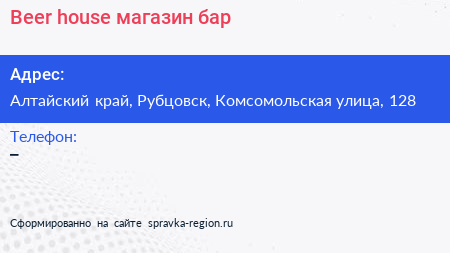 Beer house, магазин-бар по адресу Алтайский край, Рубцовск, Комсомольская улица, 128 в дальнейшем Организация, размещена в следующих категориях: