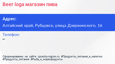 Beer loga, магазин пива по адресу Алтайский край, Рубцовск, улица Дзержинского, 16 в дальнейшем Организация, размещена в следующих категориях:
