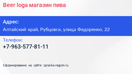 Beer loga, магазин пива по адресу Алтайский край, Рубцовск, улица Федоренко, 22 в дальнейшем Организация, размещена в следующих категориях: