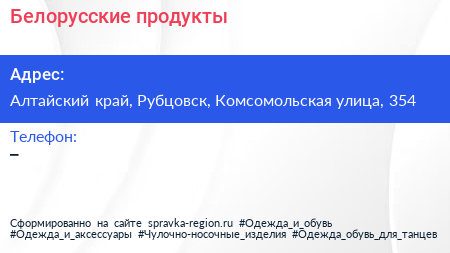 Белорусские продукты по адресу Алтайский край, Рубцовск, Комсомольская улица, 354 в дальнейшем Организация, размещена в следующих категориях: