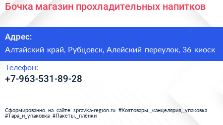 Бочка, магазин прохладительных напитков по адресу Алтайский край, Рубцовск, Алейский переулок, 36 киоск в дальнейшем Организация, размещена в следующих категориях: