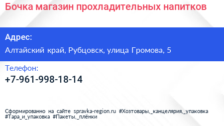 Бочка, магазин прохладительных напитков по адресу Алтайский край, Рубцовск, улица Громова, 5 в дальнейшем Организация, размещена в следующих категориях: