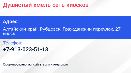 Душистый хмель, сеть киосков по адресу Алтайский край, Рубцовск, Гражданский переулок, 27 киоск в дальнейшем Организация, размещена в следующих категориях: