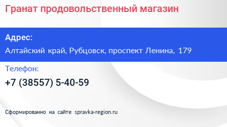 Гранат, продовольственный магазин по адресу Алтайский край, Рубцовск, проспект Ленина, 179 в дальнейшем Организация, размещена в следующих категориях: