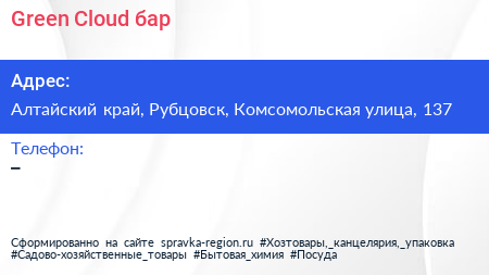 Green Cloud, бар по адресу Алтайский край, Рубцовск, Комсомольская улица, 137 в дальнейшем Организация, размещена в следующих категориях: