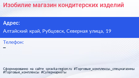 Изобилие, магазин кондитерских изделий по адресу Алтайский край, Рубцовск, Северная улица, 19 в дальнейшем Организация, размещена в следующих категориях: