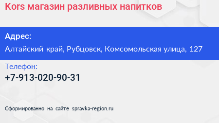 Kors, магазин разливных напитков по адресу Алтайский край, Рубцовск, Комсомольская улица, 127 в дальнейшем Организация, размещена в следующих категориях:
