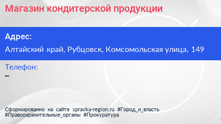 Магазин кондитерской продукции по адресу Алтайский край, Рубцовск, Комсомольская улица, 149 в дальнейшем Организация, размещена в следующих категориях: