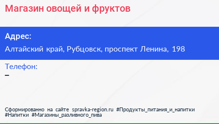 Магазин овощей и фруктов по адресу Алтайский край, Рубцовск, проспект Ленина, 198 в дальнейшем Организация, размещена в следующих категориях: