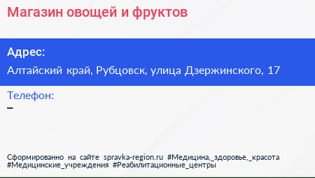 Магазин овощей и фруктов по адресу Алтайский край, Рубцовск, улица Дзержинского, 17 в дальнейшем Организация, размещена в следующих категориях: