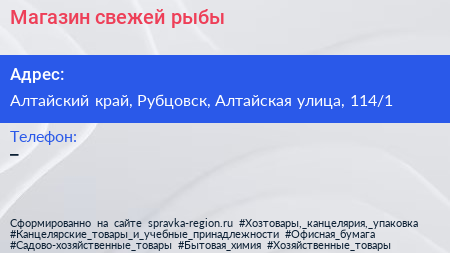 Магазин свежей рыбы по адресу Алтайский край, Рубцовск, Алтайская улица, 114/1 в дальнейшем Организация, размещена в следующих категориях: