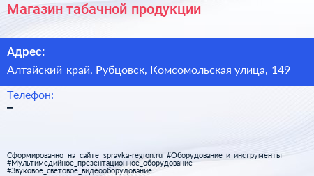 Магазин табачной продукции по адресу Алтайский край, Рубцовск, Комсомольская улица, 149 в дальнейшем Организация, размещена в следующих категориях: