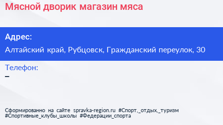 Мясной дворик, магазин мяса по адресу Алтайский край, Рубцовск, Гражданский переулок, 30 в дальнейшем Организация, размещена в следующих категориях: