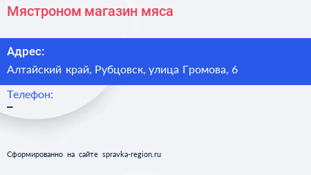 Мястроном, магазин мяса по адресу Алтайский край, Рубцовск, улица Громова, 6 в дальнейшем Организация, размещена в следующих категориях: