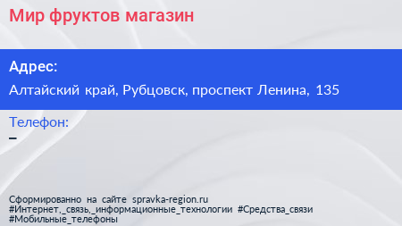 Мир фруктов, магазин по адресу Алтайский край, Рубцовск, проспект Ленина, 135 в дальнейшем Организация, размещена в следующих категориях: